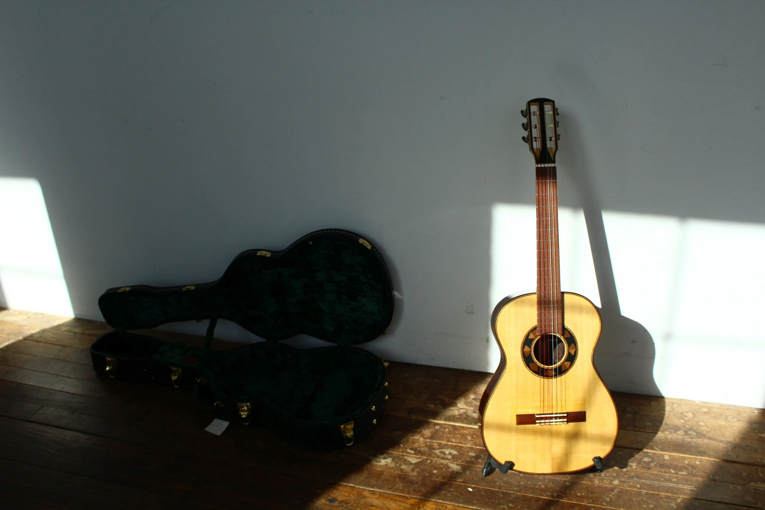 Julie Bodian demos the Queen City Guitars Classical model just outside the shop at the cotton mill in Brattleboro Vermont